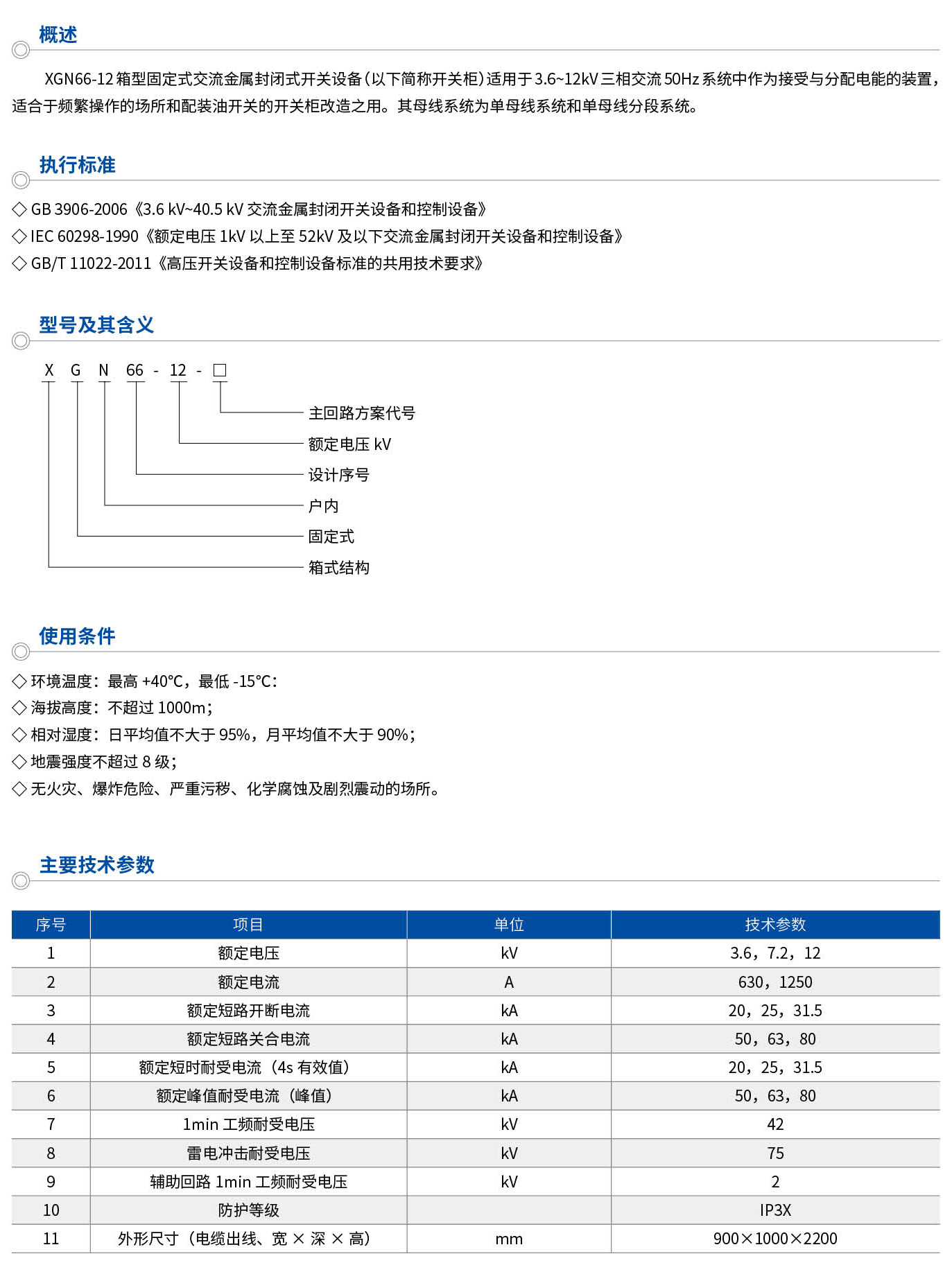 XGN66-12箱型固定式交流金属封闭式开关设备(以下简称开关柜)适用于3.6~12kV三相交流50Hz系统中作为接受与分配电能的装置,适合于频繁操作的场所和配装油开关的开关柜改造之用。其母线系统为单母线系统和单母线分段系统。